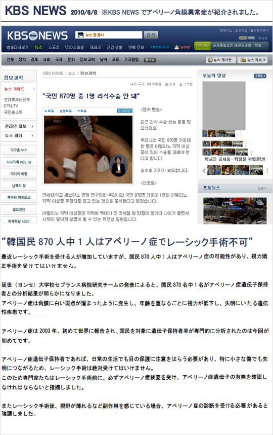 韓国のKBSNEWSでアベリーノ症とレーシックの関連についての内容が紹介されました
