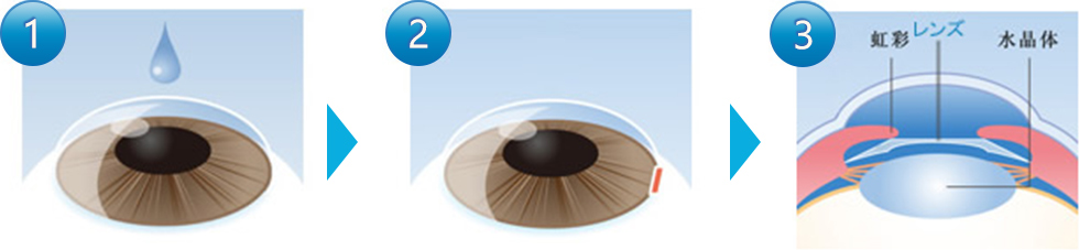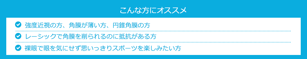 小さなレンズを眼の中に挿入し、近視・遠視・乱視を矯正する治療法です。日常の面倒なお手入れや、取り外しの必要が無いことから「眼内コンタクトレンズ」とも呼ばれています。角膜の厚さや近視・乱視の度数に関係なく受けることができるのが特徴で、レーシックが不適だった方や、角膜が薄い方、強度近視、円錐角膜など、角膜形状が不正な方にも適しています。